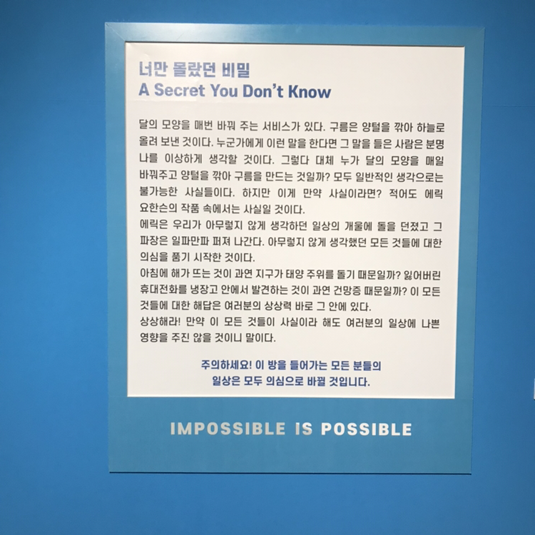 초대권이 있고, 마침 집 근처라 핸드폰만 들고 설렁 설렁 갔다. 솔직히 작가도 모르고, 사진전이라 큰 기대는 없었다. 그런데 ‘impossibe is possible’이란 말 부터 맘에 들었고,
