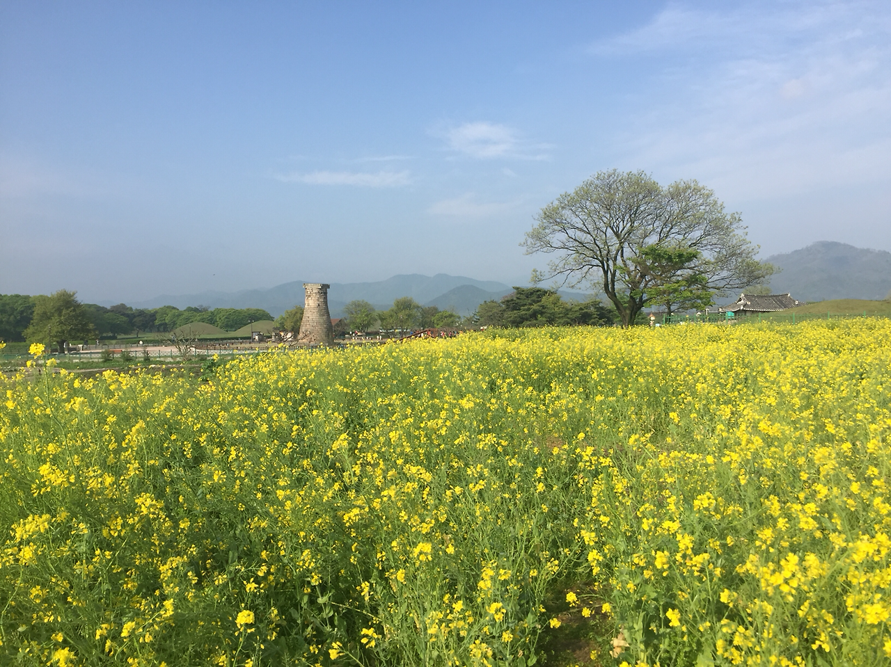 버스에서 내려 교촌마을로 가는데, 유채꽃밭이다. 바로 첨성대 앞에.