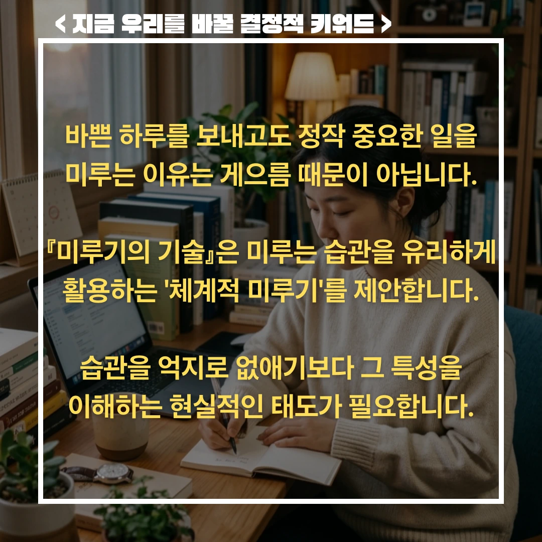 즉, 미루기를 없애려 하기보다 이 습관을 이해하고 활용하는 것이 더 현실적인 접근일 수 있다는 이야기다.
