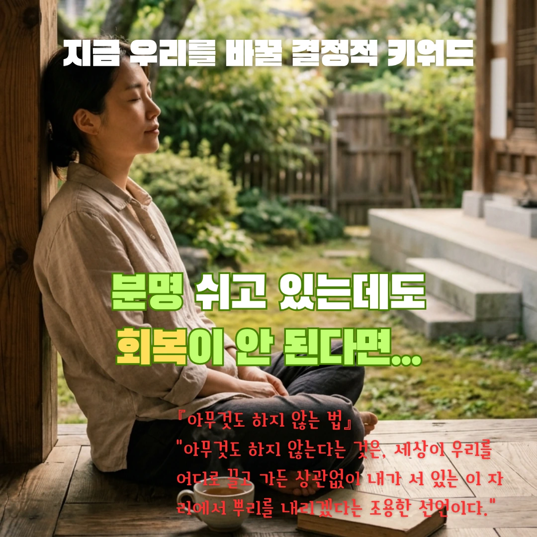 “아무것도 하지 않는다는 것은, 세상이 우리를 어디로 끌고 가든 상관없이 내가 서 있는 이 자리에서 뿌리를 내리겠다는 조용한 선언이다.”