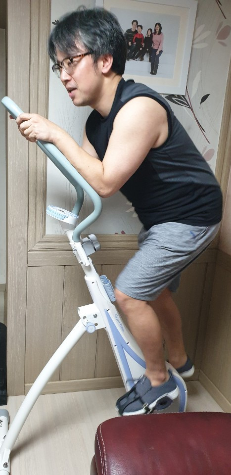 아들이 또 안장 위에 올라가 망가트릴 것을 대비해 일부러 서서 타는 것을 골랐는데 집에 와 3분간 시험운행을 해봤더니 땀이 비 오듯 흐른다. 예전 피트니스 센터에서 했던 ‘스피닝’ 같은 효과를 내는 자전거였다.
