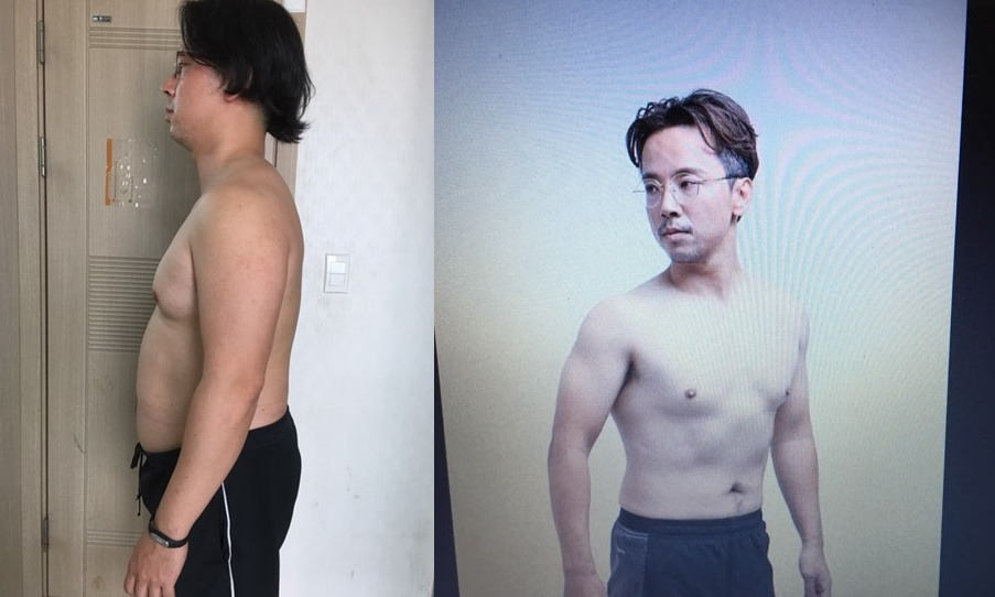 사진 왼쪽이 2017년 당시 98kg이었을 때 몸이다. 인생 최대 몸무게다. 오른쪽 사진이 이후 100일 만에 18kg을 감량하고 찍은 프로필 사진이다. 이 과정에서 물 마시기가 한 몫을 했다는 건 부정할 수 없다.