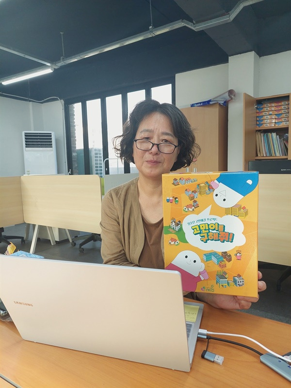 ▲ 자체 개발한 교육용 보드게임 ‘고민이를 구해줘’ 표지를 보여주고 있다.