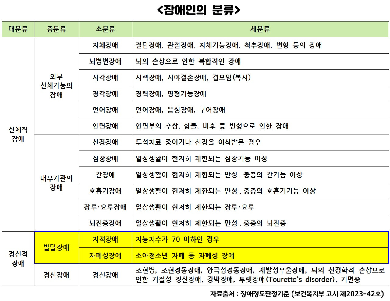 '발달장애'란 사회적인 관계, 의사소통, 인지 발달의 지연과 이상을 특징으로 하고, 제 나이에 맞게 발달하지 못한 상태를 모두 지칭한다.(서울아산병원) 보건복지부는 등록 발달장애인이 지속 증가하는 추세를 반영하여 2025년도 활동지원 예산을 2조 5323억 원으로 증액하여 발달장애인들이 지역사회에서 비장애인들과 함께 살아갈 수 있는 사회적 기반을 더욱 공고히 할 예정이라고 한다.