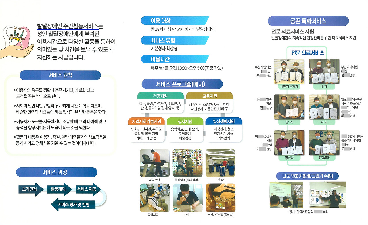"이 일은 성인 발달장애인들의 주간 활동을 도와주는 역할이에요. 발달장애인들은 말 그대로 평생 돌봐야 되고 평생 교육을 받아야 돼요. 활동지원가들이 함께하면서 계속 반복적으로 교육을 하는 거죠. 서비스 예시는 건강 지원, 교육 지원, 지역사회 기술지원, 정서 지원, 일상생활 지원을 계속하는 거예요.
