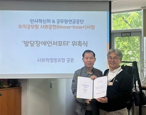 ▲ 발달장애인서포터 위촉식에서 심재성 은퇴자(왼쪽)가 위촉장을 받고 있다.