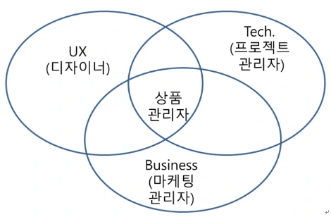상품관리자의 역할을 설명할 때 자주 인용되는 그림이 있다. 상품관리자는 마케팅관리자, 프로젝트 관리자, 디자이너 역할의 접점에 있으며 조직의 정책이나 상품관리자의 역량에 따라 접점의 크기는 달라진다.