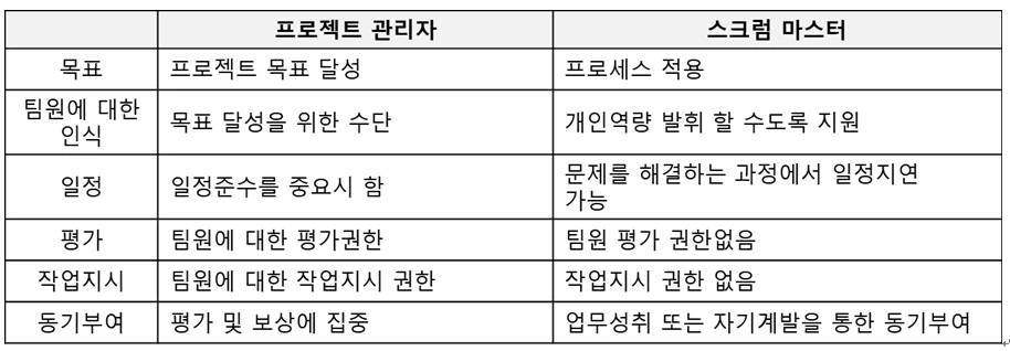 프로젝트 관리자와 스크럼 마스터의 이해관계는 상충되는 경우가 많다. 스크럼 마스터가 추구하는 교과서적인 프로세스를 통해 좋은 결과가 나올 수도 있지만, 프로젝트 관리자는 좋은 결과를 위해 때로는 교과서와는 다른 의사결정을 할 수도 있다. 프로젝트 관리자와 스크럼 마스터의 차이는 아래 표와 같다