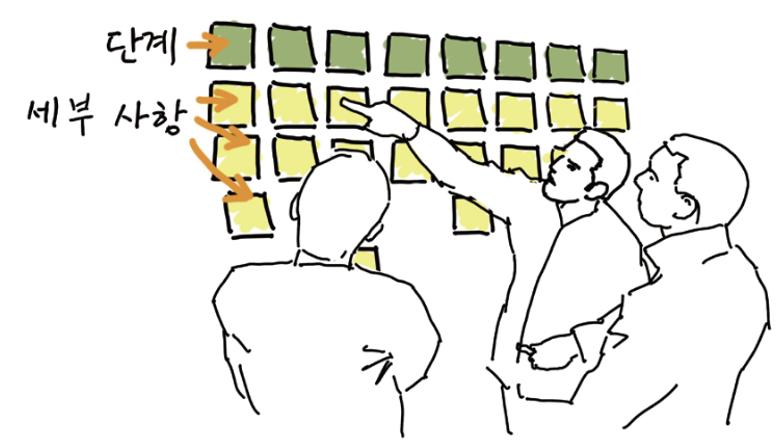 사용자 스토리 맵이란 아래 그림과 같이 하나의 카드(또는 포스트잇)에 요구사항을 작성하여 고객경험 순서에 따라 왼쪽으로 오른쪽으로, 상세화 수준에 따라 위에서 아래로 배치한 것입니다.
