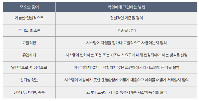 모든 사람들이 요구사항 내용을 동일하게 이해하기 위해서는 사람에 따라 해석이 달라질 수 있는 모호한 형용사가 아닌 명확한 단어를 사용해야 합니다. 상품의 우수함을 설명하기 위해 콘셉트 수준에서 형용사를 사용할 수는 있지만 요구사항 문서에서 형용사 사용은 부작용만 발생합니다.‘사용자는 조회한 상품을 쉽게 주문할 수 있어야 한다’는 요구사항 대신 ‘사용자는 조회한 상품을 3초 내에 주문 완료할 수 있어야 한다’는 식으로 정의해야 합니다. 요구사항을 정의할 때 유의해야 할 모호한 표현 및 대응방안은 다음과 같습니다.