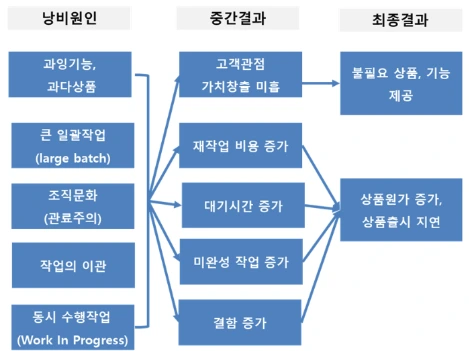 상품개발의 낭비는 고객관점에서 가치를 창조하지 못하는 활동에 투입된 시간과 비용이다. 최악의 낭비는 고객이 외면하는 상품을 만드는 것이다. 고객이 원하는 상품을 만들더라도 제품생산 또는 서비스제공의 원가가 높아지거나 출시가 지연되면 이 또한 낭비다. 소프트웨어 상품개발의 낭비원인과 결과를 정리하면 아래 그림과 같다.