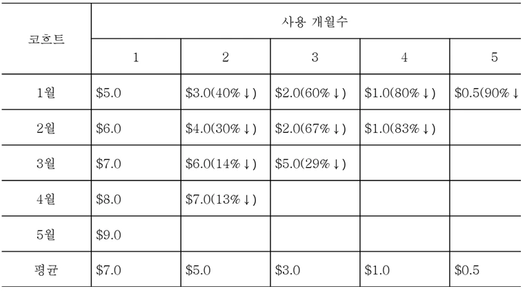 이과 같이 사업 성장성을 확인 할 수 있는 대표적인 기법이 ‘코흐트(Cohort) 분석’이다. 코로나 19로 ‘코흐트 격리’를 많은 사람들이 알게되었다. 코호트란 ‘특정 기간에 특정 경험을 공유한 사람들의 집합’이다. 2020년 상반기 코로나 19가 확산되었을 때 병원이나 아파트내 있는 모든 사람들(또는 특정 층의 사람들)을 특정일 기준으로 격리한 것을 ‘코흐트 격리’라고 하는 것도 같은 맥락이다. 매월 신규로 가입하는 고객이 증가하고, 가입고객이 이탈하지 않고, 지속적인 구매를 한다는 증거를 확보하면 비즈니스 성장에 대한 증거를 확보한 것이다. 월별(또는 주별) 신규고객을 별도로 분석하지 않고 총 사용량, 매출로만 파악하면 성장에 대한 정확한 분석은 할 수 없다. <린분석,2014>의 코흐트분석 사례로 상세한 내용을 설명하겠다.