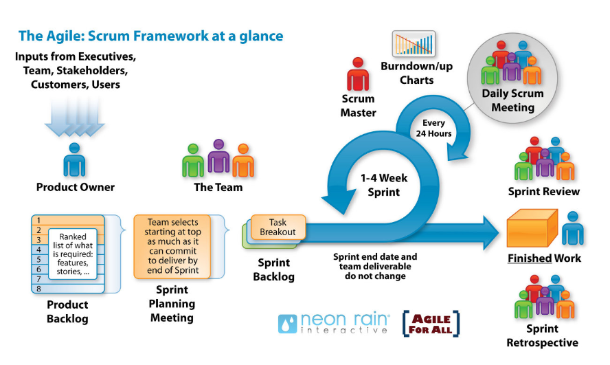 제프 서덜랜드와 캔 슈와버도는 척박한 소프트웨어 개발 환경을 개선하고자 노나카 교수의 이론을 1994년부터 소프트웨어 개발에 적용하면서 스프린트를 핵심으로 하는 스크럼 프로세스를 정립하여 2002년에 ‘스크럼’을 출간하였다. (국내는 2008년에 번역본 출간) 스크럼 프로세스를 그림으로 요약하면 다음과 같다.