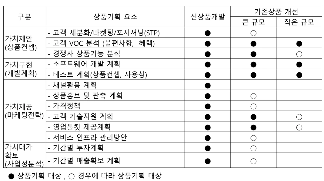 특정기업에서 다룬적이 없는 신상품을 출시하는 것과 기존에 출시한 상품을 개선하는 것은 상품기획 관점에서 많은 차이가 있다. 기존에 출시한 상품을 개선할때에는 고객군, 고객가치, 채널, 마케팅 전략, 경쟁사 분석, 가격정책 등에 대한 추가분석이 불필요한 경우가 많다. 물론 스마트폰이나 윈도우처럼 업그레이드 규모가 큰 경우에는 고객가치, 채널, 마케팅 전략, 경쟁사 분석, 가격 등을 새롭게 분석해야 할 수도 있다. 그러나 기 출시된 상품의 작은 개선을 위한 상품기획은 고려할 항목이 대폭 줄어든다. 개선하고자 하는 기능에 대한 고객 VOC가 명확한지, 개발계획은 적정한지 등을 중심으로 분석하고 필요시 영업지원, 기술지원 문서의 버전업을 수행하면 된다. 신규 상품 개발, 기존상품의 큰 개선, 기존상품의 작은 개선의 세가지 유형별로 상품기획시 고려할 사항을 정리하면 아래 표와 같다.