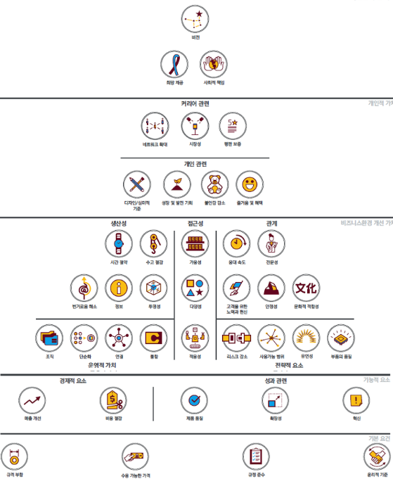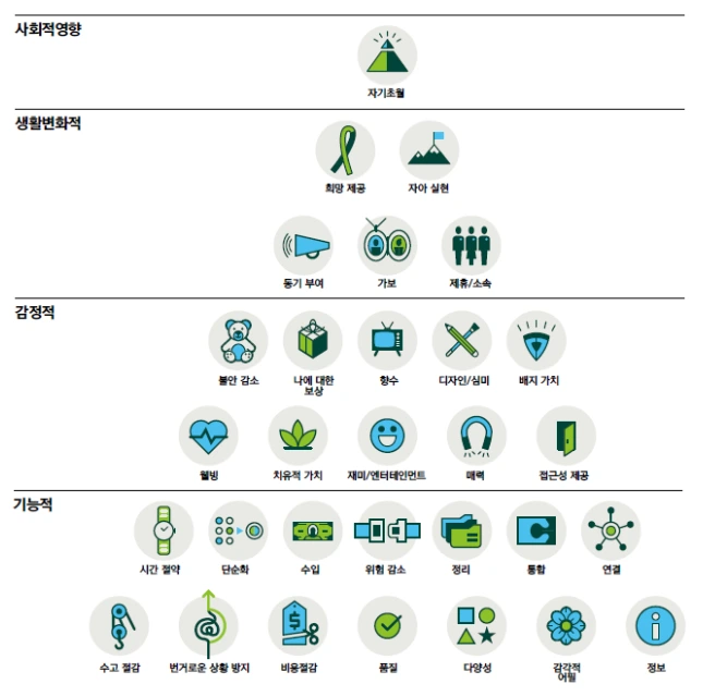 <하버드 비즈니스 리뷰, 2016>에서는 B2C 상품의 고객가치를 구성하는 요소를 아래와 같이 4개 범주 30개 요소를 피라미드 형태로 정리했다. 매슬로우 욕구 5단계의 아랫부분은 생존, 안전이고 상위단계는 자아실현이듯이 가치 피라미드의 아래 단계는 상품의 기능적 요소들이고 상위단계는 개인의 생활을 변화시키고 사회에 참여하는 요소들이다. 매슬로우 이론에서 하위욕구가 충족되지 않고 상위욕구로 전환이 어렵다고 이야기했듯이 상품의 가치속성도 기능에 대한 기본적인 충족 없이(주로 품질) 상위의 가치속성을 충족시키기는 어렵다.