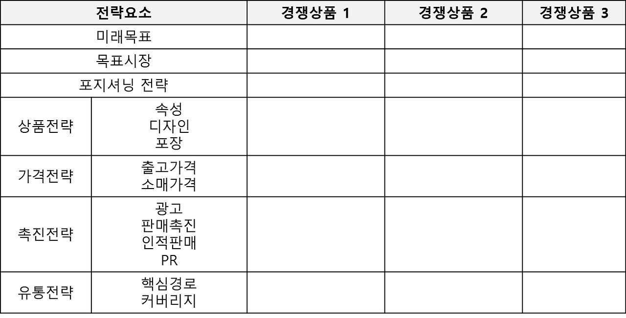 상품차별화는 경쟁우위를 확보하기 위해 경쟁상품 대비 기능 및 기능외 특성을 차별화하는 활동이다. 상품차별화가 명확할수록 해당 상품의 포지셔닝이 쉬워진다. 경쟁상품 분석결과를 아래 표와 같이 정리하면 차별화 요인을 쉽게 확인할 수 있다.