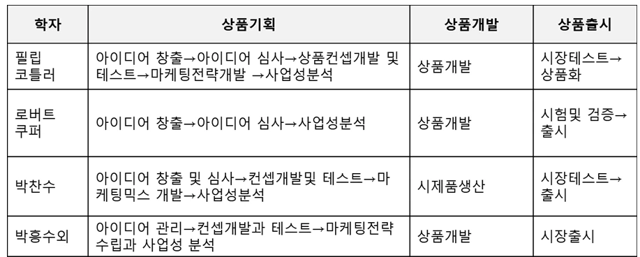 신상품 개발 프로세스의 구성체계는 학자에 따라 차이가 있다. 대표적인 신상품 개발 프로세스는 아래 표와 같다. 상품 생산, 자재 구매, 판촉활동등은 운영업무이며 신상품 개발 프로세스의 범위가 아니다.
