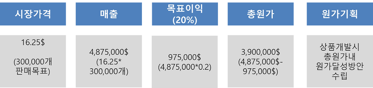만일 상품의 목표 판매량이 100,000개라면 단위원가는 13$가 될 것이다.