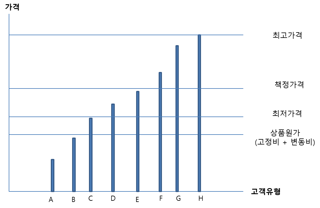 예를 들어 고객유형이 A부터 H까지 있고 고객유형별로 특정상품에 대해 지불할 수 있는 가격이 아래 그림과 같다고 가정하자. 만일 하나의 가격만 적용하면(책정가격) E까지의 고객에게는 상품을 판매하지 못하는 기회손실이 발생한다. 적자를 보지 않고 판매할 수 있는 가격은 최저가격 이상이어야 하기 때문에 A, B 고객 외 모든 고객에게 고객이 지불할 수 있는 최대금액으로 상품을 판매하는 것이 이익 극대화를 위한 방안이다.