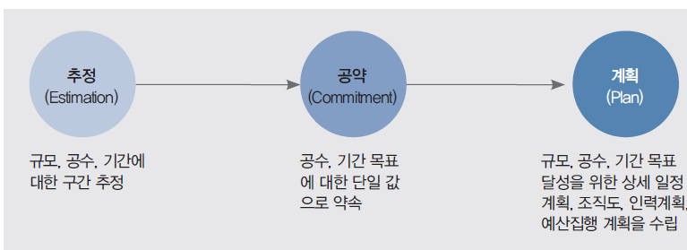 상품관리자와 프로젝트관리자는 구간 추정이 아닌 점 추정을 요청 받는 것이 현실이다. ‘부산까지 몇 시간 걸리는가’가 추정의 문제라면 ‘부산에 몇 시까지는 도착하겠다’는 공약(commitment)의 문제이다. 추정이 의욕치를 배제한 객관적인 분석의 과정이라면, 공약은 의욕치를 포함한 주관적인 약속의 과정이다. 이런 관점에서 계획은 공약을 달성하기 위한 방안이다. 프로젝트에서 중요한 것은 공약이며, 추정은 공약을 위한 과정이다. 프로젝트를 실패했다는 것은 공약을 지키지 못한 것을 의미하는데, 공약의 실패는 추정의 실패일 수도 있지만 실행의 실패일 수도 있다. 이상을 정리하면 아래 그림과 같다.