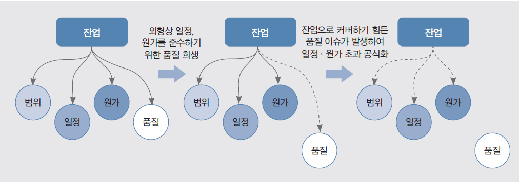 신상품 개발의 대표적인 제약조건은 범위, 일정, 자원(예산)인데 이는 추정의 대상이 되기도 한다. 제약조건을 해결하기 위한 방법은 다음 세 가지가 있다.