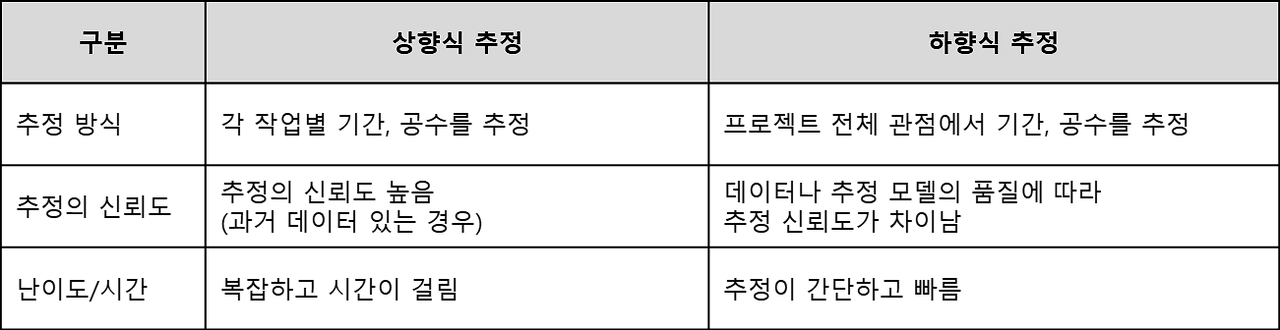상향식 추정은 팀원들이 추정한 각 작업의 기간, MD(또는 MM)를 취합하여 전체 프로젝트의 MM와 개발기간을 추정 할 때 활용한다.