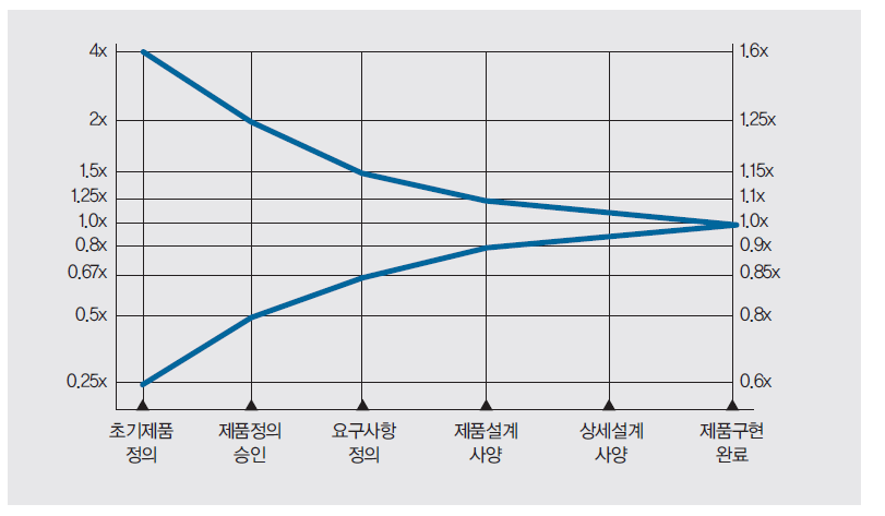 상품개발 단계를 진행하면서 상품 요구사항의 불확실성은 감소한다. 스티브 맥코넬은 이를 ‘불확실성의 원뿔 (cone of uncertainty)’이라고 하였다. 그림 *과 같이 프로젝트 개념을 잡는 초기에는 추정의 오차가 무려 16배가 됨을 알 수 있다.
