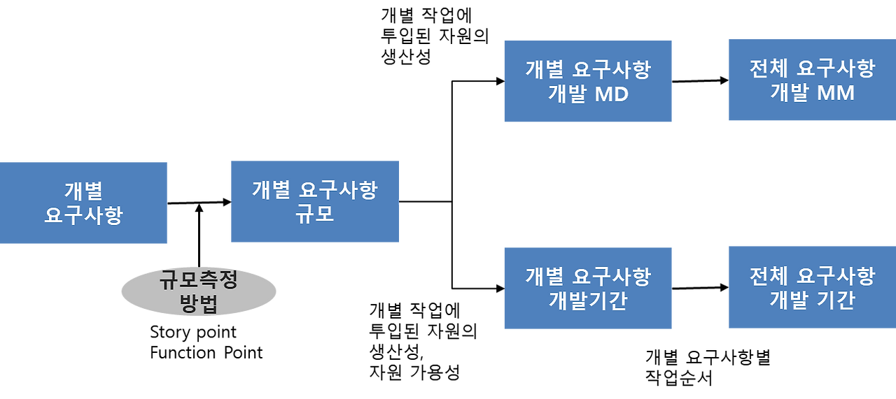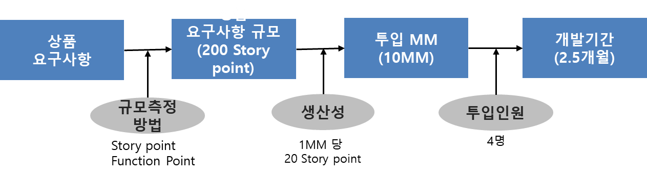 ② 프로젝트 팀의 생산성을 감안하여 주어진 업무를 완료하기 위한 투입MM를 추정한다. (투입 MM = 요구사항 규모/생산성)