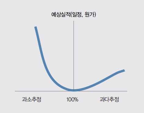 만일 추정치가 프로젝트 실적에 영향을 미친다면 프로젝트 착수시점에서 ‘진짜 원가’나 ‘진짜 일정’이 있기나 한 것일까? 결론은 100퍼센트 정확한 추정치는 없고, 프로젝트 팀원들의 노력으로 달성 가능한 구간은 존재한다는 것이다. 조직의 성숙도가 높아질수록 추정의 정확도가 높아져 추정구간의 크기도 작아질 것이다.