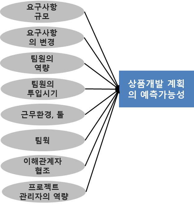 예를 들어 A라면 개발기간이 10개월이고, B라면 개발기간이 8개월이라고 정의할 수 없다는 것이다. 프로젝트 관리자가 B를 가정하고 8개월을 목표를 설정하면 가정은 잊히고 목표만 기억되는 경우가 많다. 중요한 결정은 시간이 허용하는 최후의 순간까지 미루는 것이 좋다. 또한 프로젝트 성과에 영향을 미칠 수 있는 중요한 가정들을 별도 페이지에 명확하게 기술해 두는 것이 좋다. 그 이유는 개발계획 수립 시 가정들이 적합한지 검토해야 하고, 프로젝트를 진행하는 과정에서도 가정들이 유효한지 정기적으로 검토해야 하기 때문이다. 상품개발 계획서의 예측가능성은 가정이 작을수록 높아진다. 상품개발 계획의 예측가능성에 영향을 미치는 각종 가정의 예는 아래 그림과 같다.