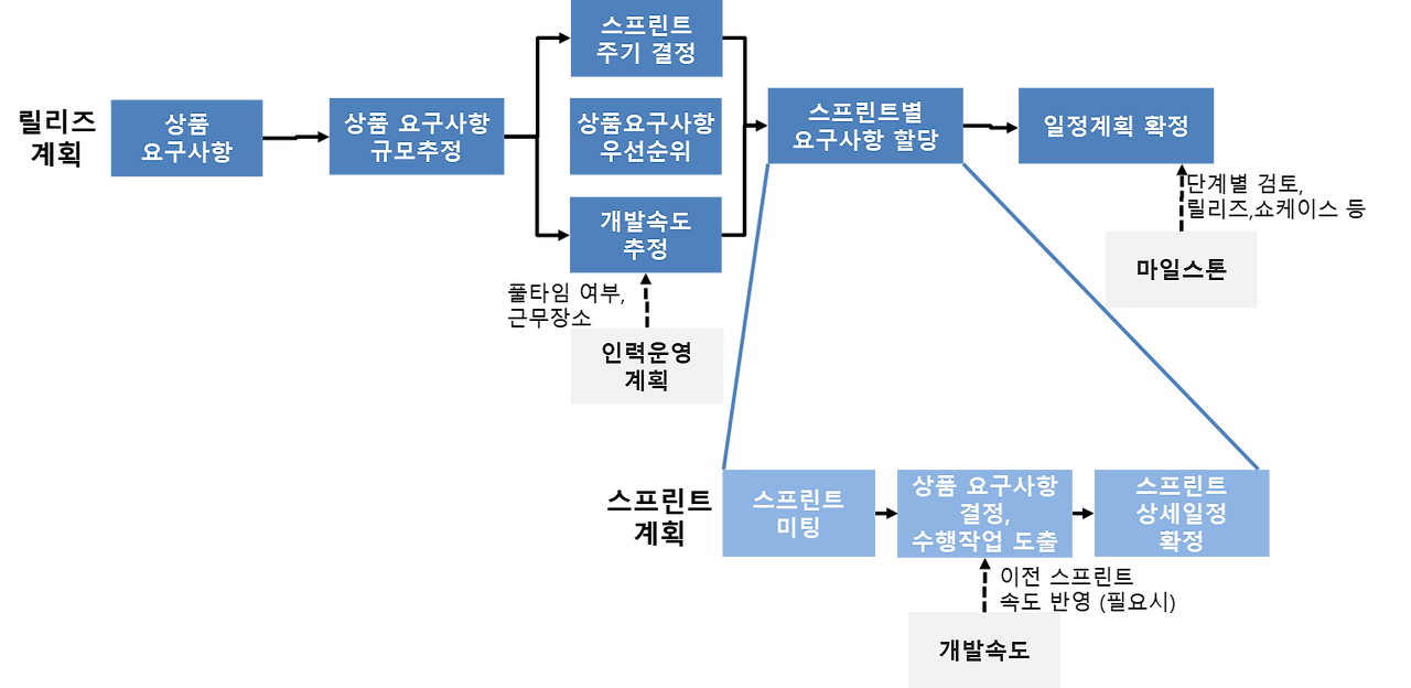 애자일 상품개발 계획수립은 릴리즈 계획을 하향식으로 정의한 뒤, 스프린트 계획을 상향식으로 확정하는 점진적 상세화 계획수립 방법이다. 애자일 상품개발 계획에서는 아래 그림과 같이 점진적으로 상세화 하기에 요구사항 변경에 유연하게 대응할 수 있다.