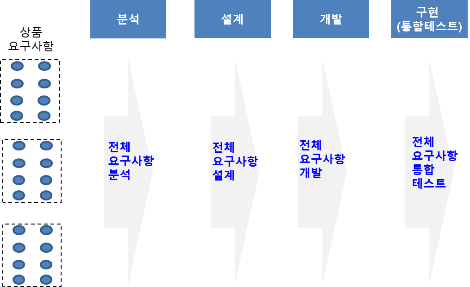 폭포수 모델에서는 프로젝트 착수시점에서 전체 상품요구사항을 상세하게 정의 한 뒤 전체 상품 요구사항에 대한 분석, 설계, 개발, 통합테스트를 순차적으로 수행한다.