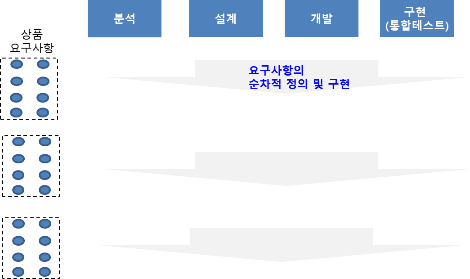 애자일 모델에서는 착수시 모든 상품요구사항을 상세하게 정의하지 않고, 일부 요구사항을 정의하고 해당 요구사항 구현을 위한 분석/설계/개발/테스트를 수행한다.