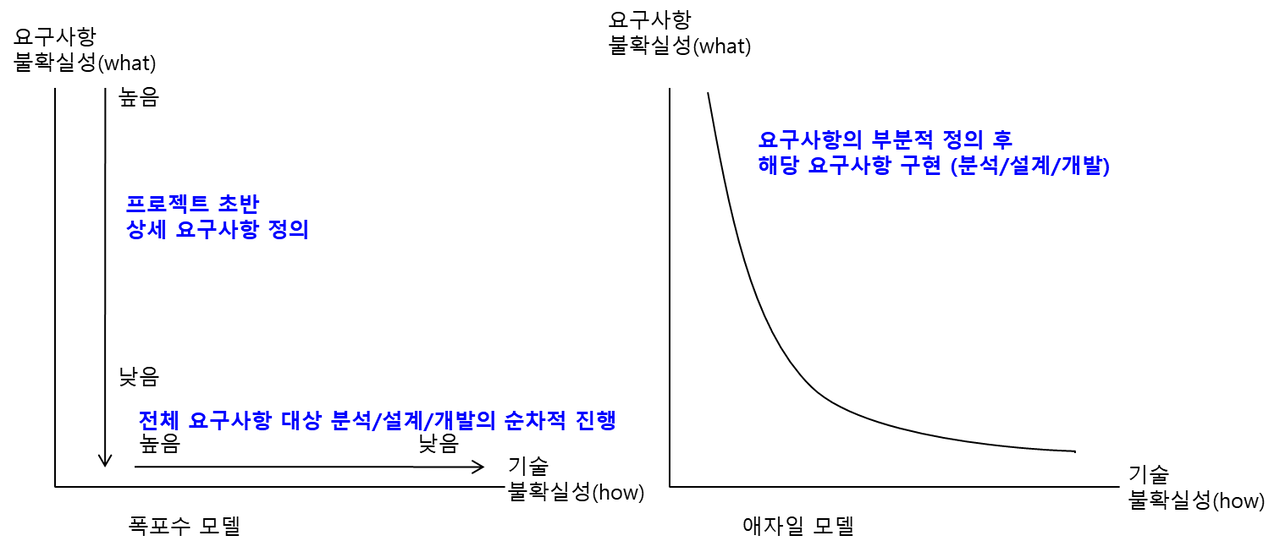 폭포수 모델과 애자일 모델을 구분하는 대표적인 요인은 불확실성을 관리하는 방법이다. 상품개발의 불확실성은 상품요구사항의 불확실성(what)과 엔지니어링 기술의 불확실성(how)으로 구분된다. 신기술이나 새로운 방법론을 적용하지 않으면 기술 불확실성은 낮고 상품 요구사항 불확실성만 남는다.폭포수 모델은 프로젝트 착수 초기에 모든 상품요구사항을 상세하게 정의하고 프로젝트를 진행하면서 기술적 불확실성을 낮추는 반면, 애자일 모델은 착수 초기에 요구사항의 불확실성과 기술의 불확실성이 높음을 인정하고 프로젝트를 진행하면서 둘 다 조금씩 낮춘다.