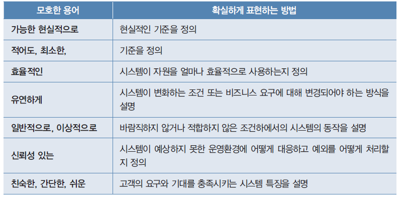사람들의 판단을 흐리게 할 수 있는 형용사를 사용하면 테스트가 힘들고 종료기준이 불명확해진다. ‘사용하기 편리한’ ‘최대한’ ‘단순한’ 등과 같은 단어는 사용하지 않거나 측정 가능한 기준을 정하는 것이 좋다. 예를 들어 ‘사용자는 조회한 상품을 쉽게 주문할 수 있어야 한다’는 요구사항 대신 ‘사용자는 조회한 상품을 3초 내에 주문 완료할 수 있어야 한다’는 식으로 정의해야 한다.