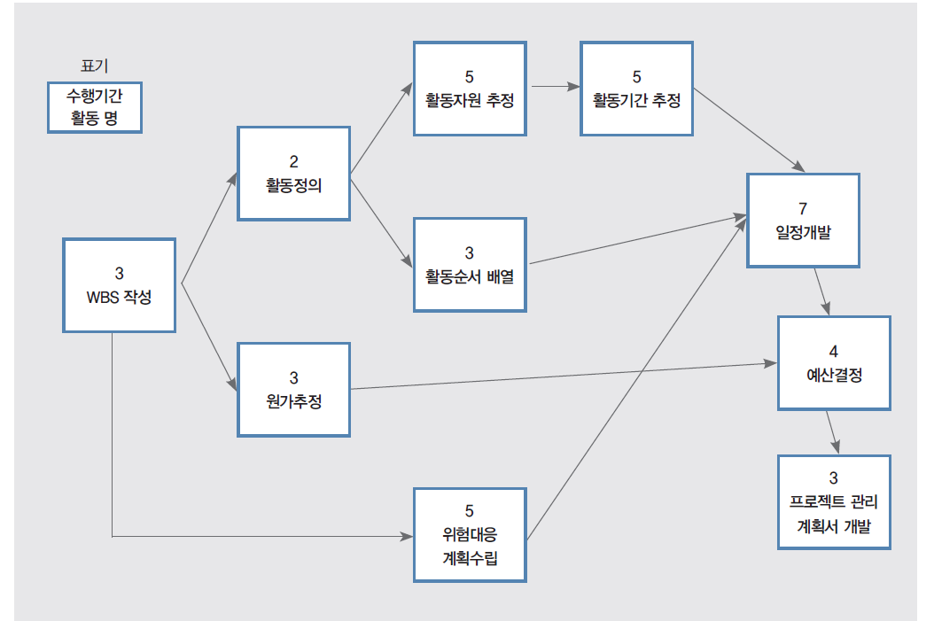 특히 건설 프로젝트는 지연되면 페널티 또는 기회비용이 발생하기 때문에 주공정 관리가 중요하다. 소프트웨어 개발은 주공정 관리의 필요성이 상대적으로 낮지만 기본개념은 숙지할 필요가 있다. 주공정을 계산하기 위해 ‘프로젝트 계획 수립’의 예를 들어보자. PMBOK에서는 프로젝트 관리계획서 개발을 위해 아래 그림과 같이 총 10개의 작업을 제시하고 있다. 실제로는 더 많은 활동이 있지만, 프로젝트 계획을 수립하기 위해서 그림에 있는 활동만 수행한다고 가정할 때 프로젝트 계획수립을 몇 일 만에 할 수 있을까? 이 그림에서는 비교적 간단하지만, 활동의 수가 많거나 연관관계가 복잡하면 정답을 구하기가 어렵다. 물론 프로젝트 일정관리 도구가 계산해주기 때문에 일일이 계산할 필요는 없다. 하지만 프로젝트 전체 수행기간을 어떻게 도출하는지 기본규칙은 알고 있어야 한다.