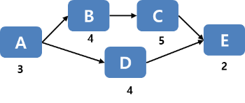다섯 가지 작업으로 구성된 프로젝트가 있고 작업 수행순서와 각 작업의 수행기간(일)이 그림 *과 같다고 가정하자.