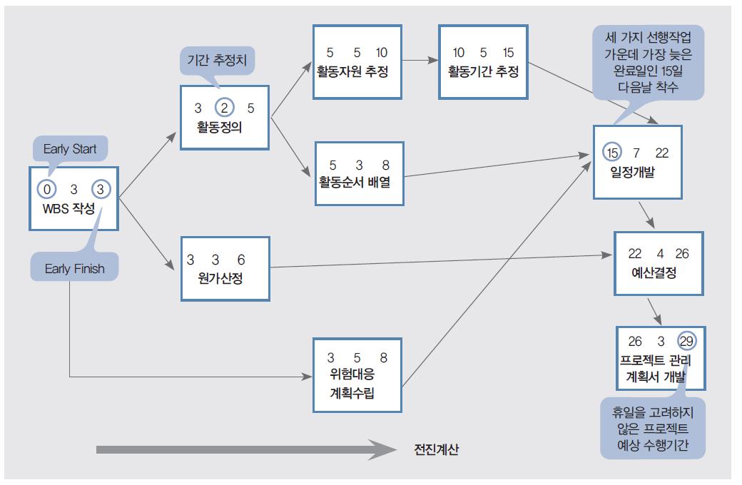 전진계산(forward scheduling)은 그림 *와 같이 각 작업의 빠른 착수일(Early Start, ES)과 빠른 종료일(Early Finish, EF)을 계산하여 달성 가능한 가장 빠른 종료일을 도출한다.