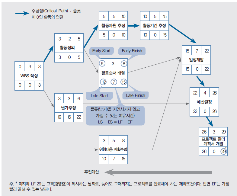 주공정을 계산하기 위해서는 전진계산을 통해 달성 가능한 일정을 계산하고, 후진계산을 통해 달성해야 하는 일정을 계산한다.