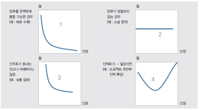 • 프로젝트 후반부의 인력 추가는 일정을 지연시킬 수 있음