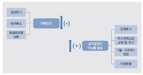 지연된 일정을 만회하기 위한 계획변경에는 일정연기, 범위축소, 품질목표를 낮추는 방안이 있다.
