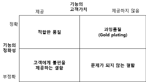 품질에 대한 일반적인 정의는 ‘고객이나 사용자를 만족시킬 수 있는 제품이나 서비스의 특성’이다. 고품질 상품과 헷갈리는 것이 다기능 상품이다. 상품의 기능이 많은 것과 품질이 좋은 것은 다르다. MS 워드는 메모장과 비교가 되지 않을 정도로 많은 기능이 있지만 고품질이라고는 이야기할 수 없다. 메모장을 사용하는 사람이 MS워드의 기능을 기대하지는 않는다. 메모장 사용시 원하는 기능을 수행하지 못한 경험이 있는가? 반면 MS 워드는 원하지 않는 필요 이상의 기능을 수행하여 고객을 당황스럽게 하는 경우가 많다.고객의 입장에서는 기능의 고객가치 제공과 기능의 정확성 관점에서 4가지 유형의 품질로 구분할 수 있다.