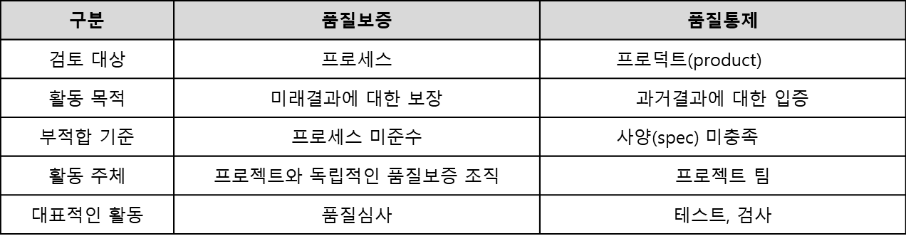품질통제와 품질보증은 품질향상을 위한 대표적인 활동이다. 품질통제는 결함을 제거하기 위한 활동으로 테스트가 대표적인 예이다. 반면 품질보증은 체계적인 품질통제 활동을 수행하는지 확인하는 활동으로 심사(audit)가 대표적인 예이다. 품질통제 활동이 산출물의 결함을 제거하여 품질을 높이는 방법이라면, 품질보증활동은 프로세스 결함(미 준수, 비효율)을 제거하여 산출물의 품질을 높이는 방법이다. 품질보증과 품질통제를 구분하면 아래 표와 같다.