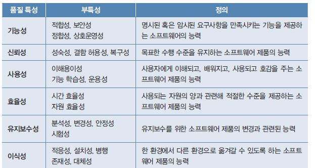 〈ISO / IEC 9126 소프트웨어 품질 특성과 척도에 관한 지침〉은 소프트웨어의 품질 특성과 품질 부 특성을 아래 표와 같이 정의하고 있다. 품질특성은 개념적으로는 명확하지만 객관적인 품질지표로 정의하는 것은 쉽지 않다. 아래 품질특성 중 고객관점에서 중요한 품질목표를 계량적으로 정의하여 관리할 것을 권고한다.
