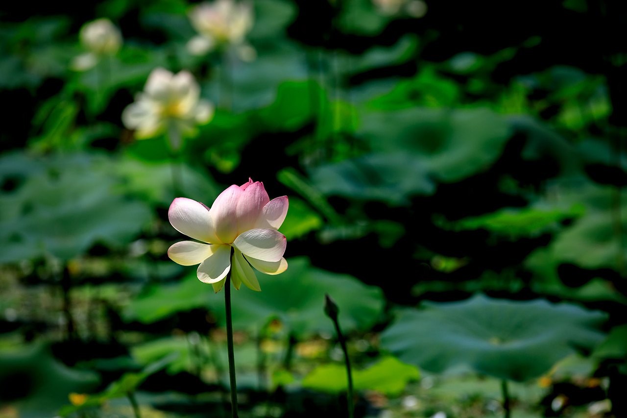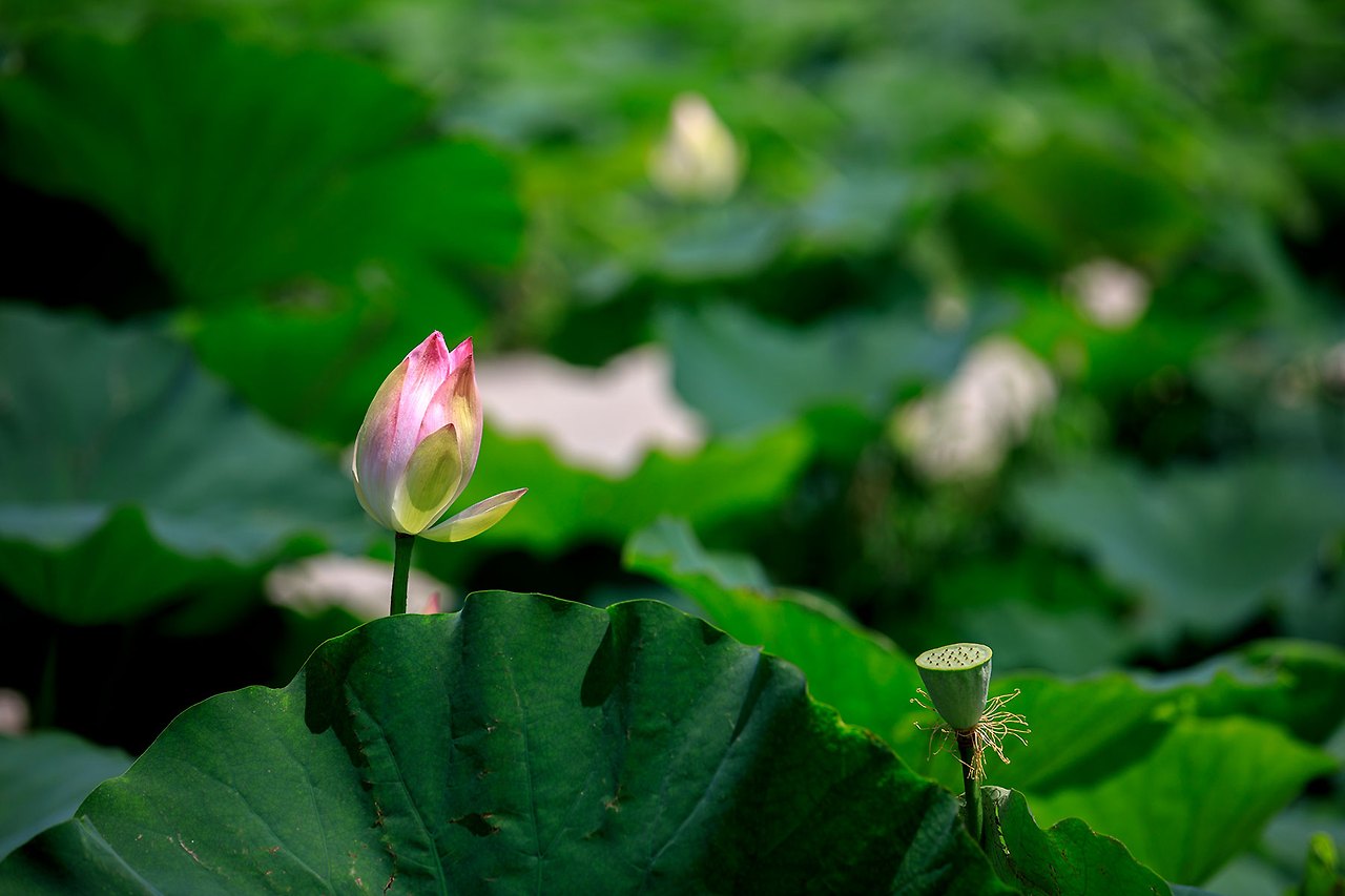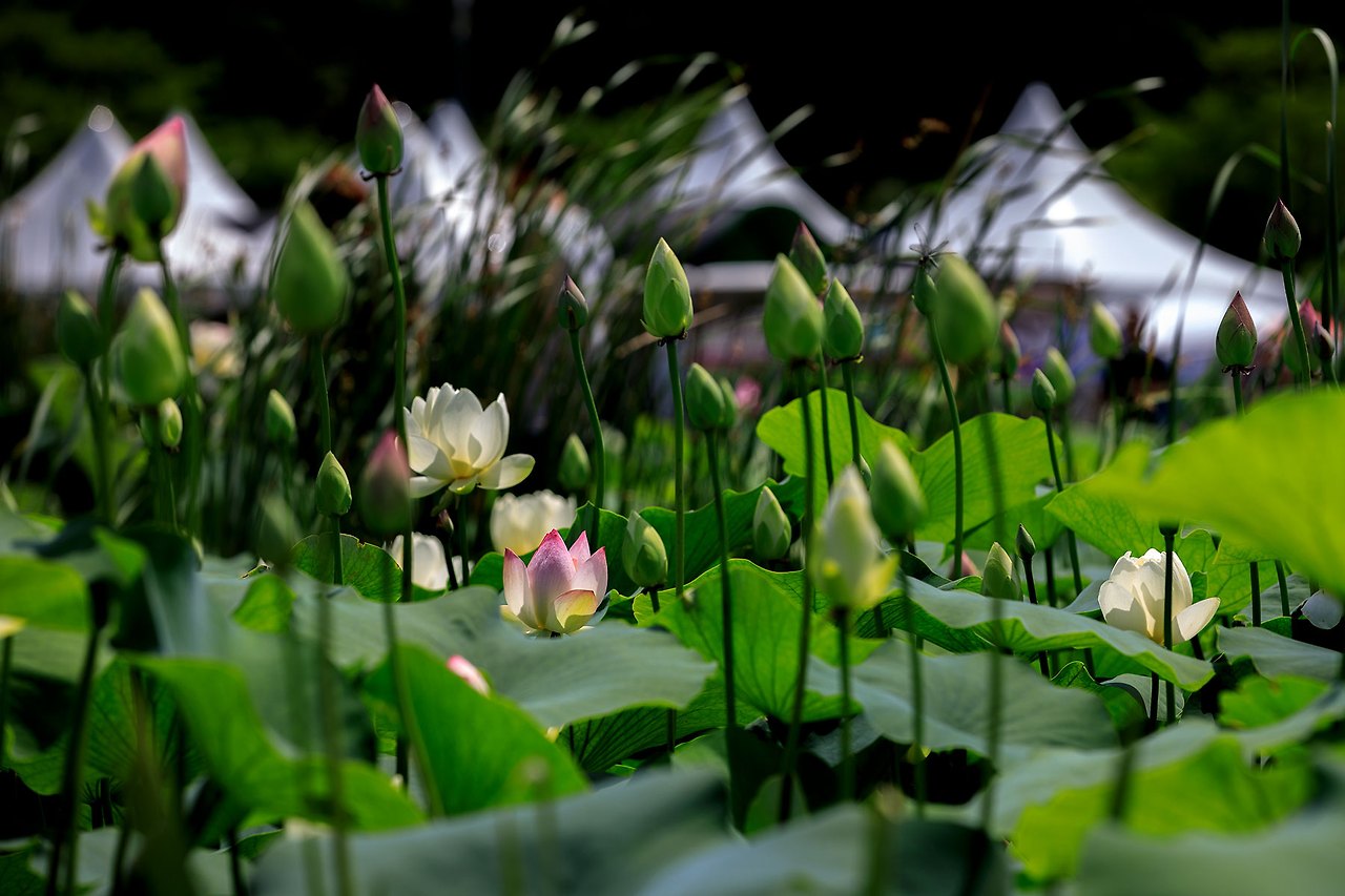 처음의 연꽃을 피워내기 위해 저마다의 연잎은 서로 다투듯이 하늘을 바라보고 있으며 그 사이를 새침한 새색시처럼 뽀얀 속살들을 감춘채 다소곳하게 고개를 내민 연꽃들이 녹색의 연잎과 보색을 이루며 눈에 띄게 한다.