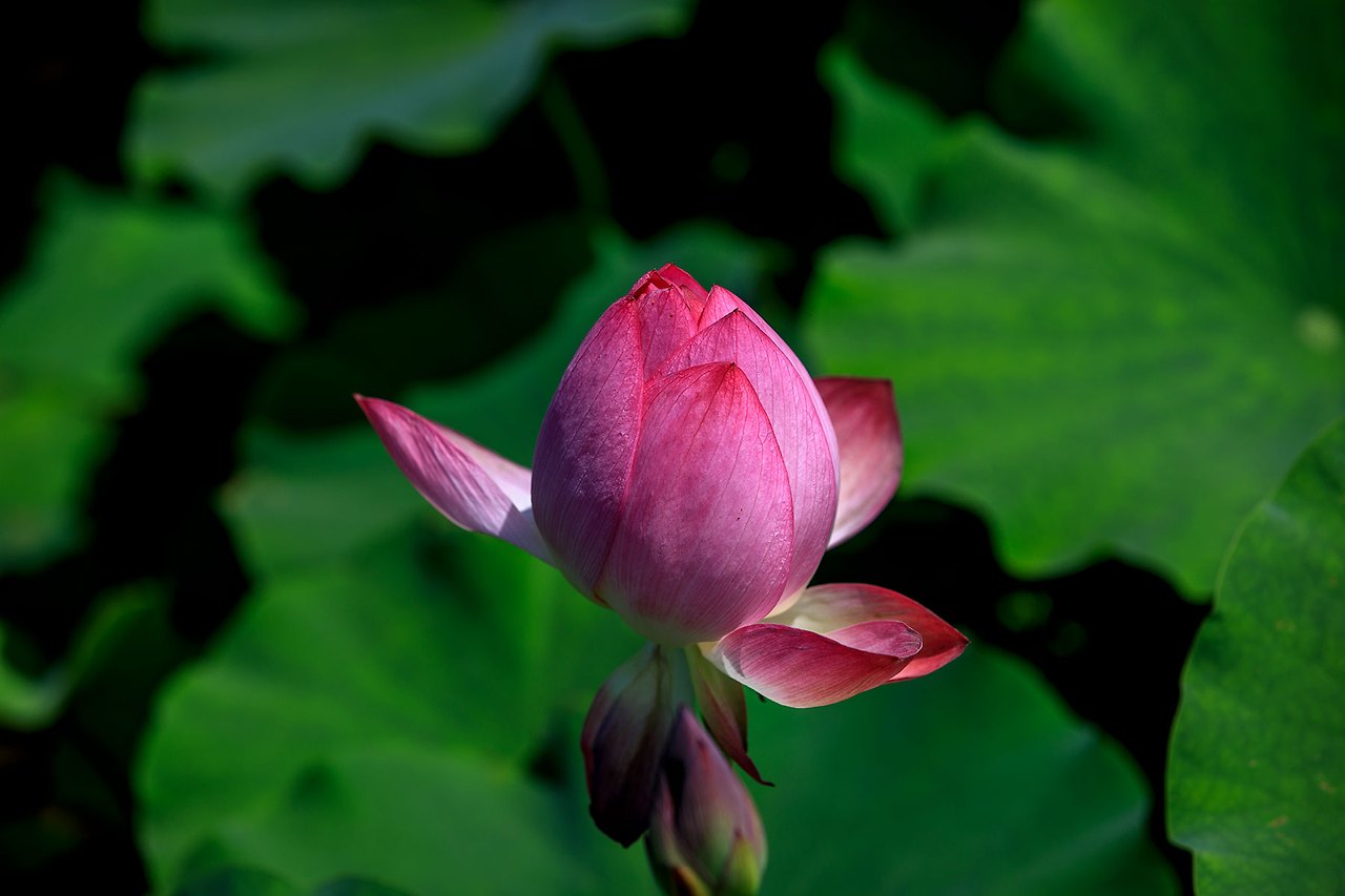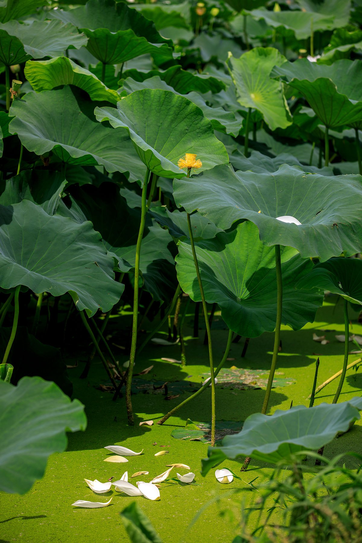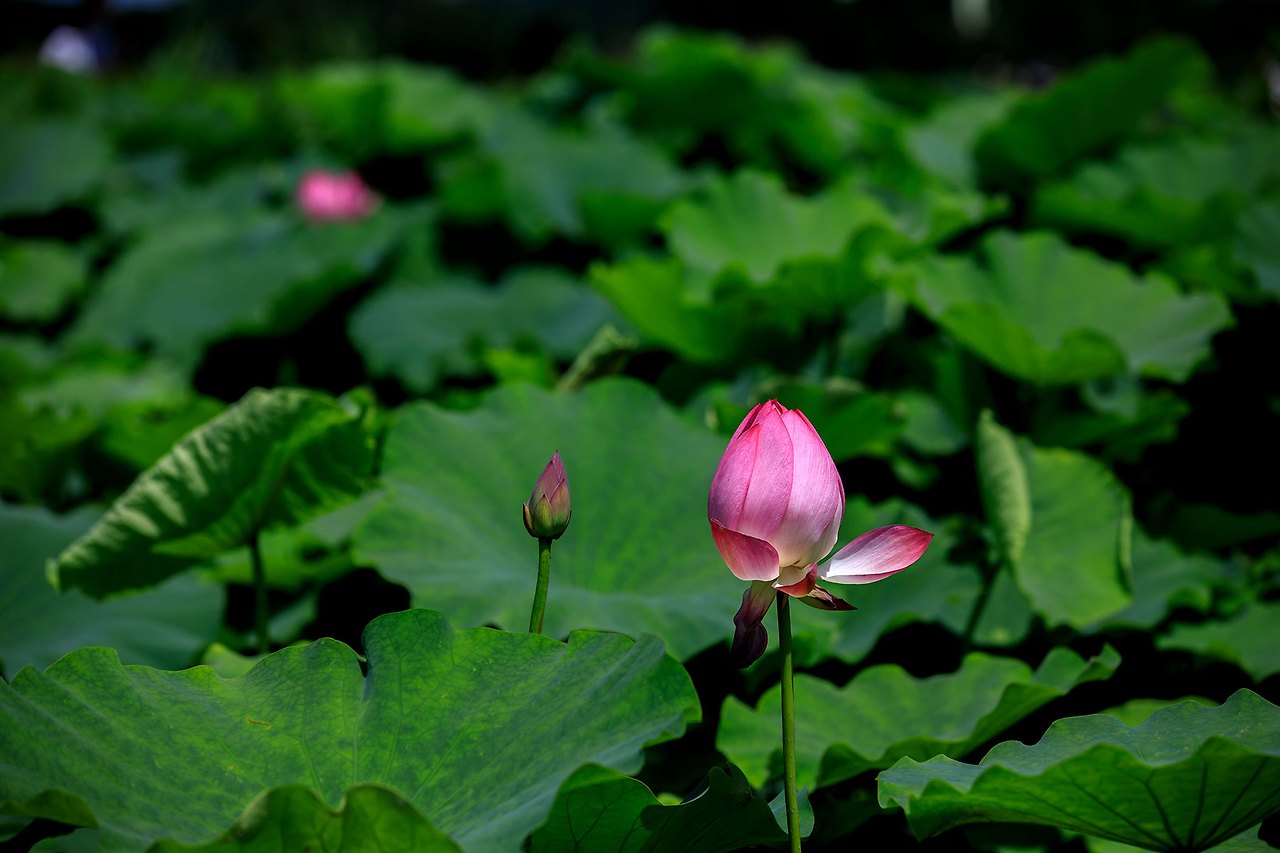 처음의 연꽃을 피워내기 위해 저마다의 연잎은 서로 다투듯이 하늘을 바라보고 있으며 그 사이를 새침한 새색시처럼 뽀얀 속살들을 감춘채 다소곳하게 고개를 내민 연꽃들이 녹색의 연잎과 보색을 이루며 눈에 띄게 한다.