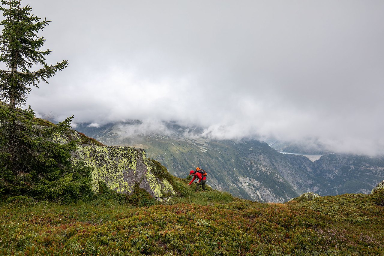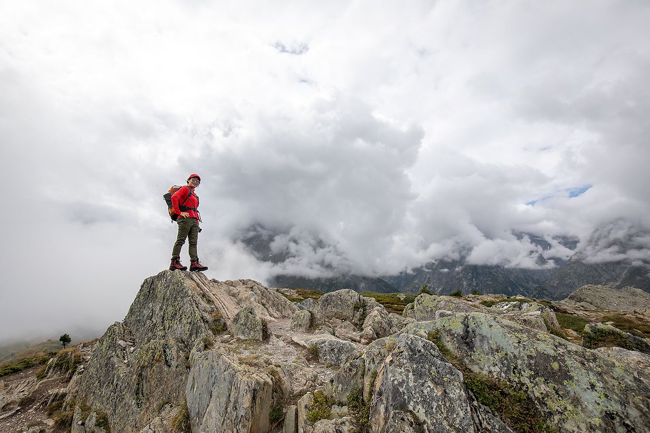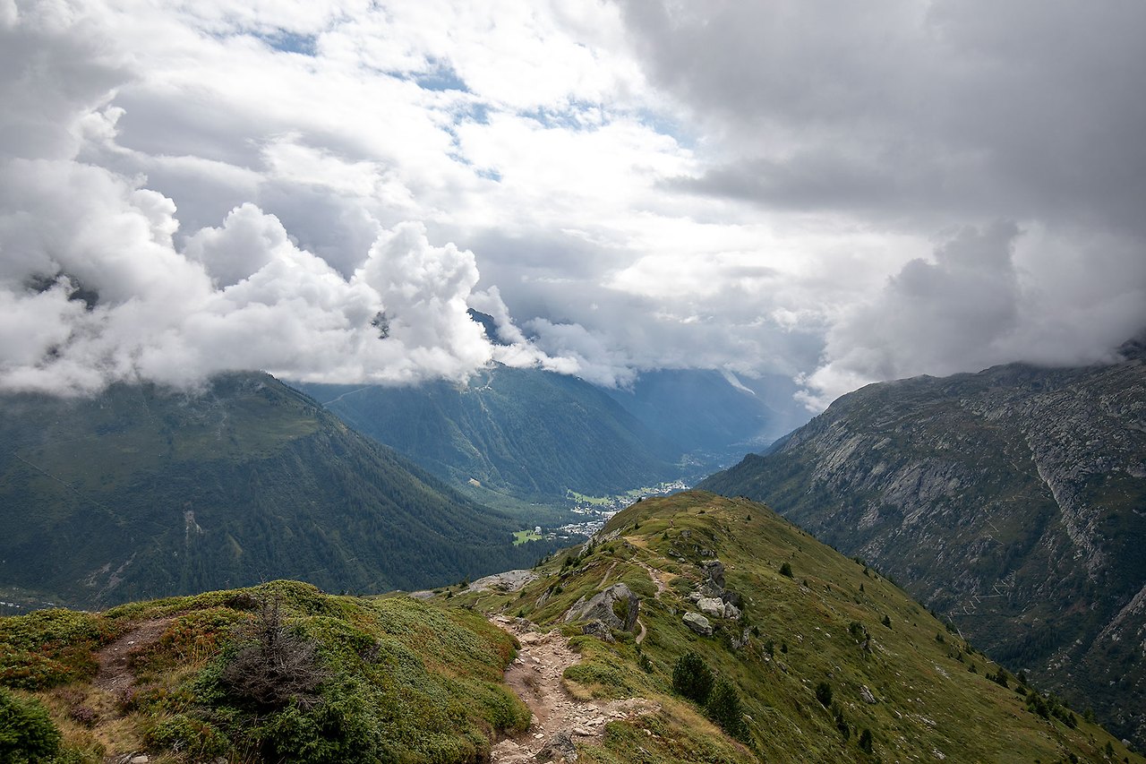 블루베리를 따 먹다 보니 어느덧 L'Aiguillette des Posettes 능선에 올랐다. 운무에 휘감겨 있는 몽블랑과 북쪽으로는 Vallorcine과 Emossom Dam, 남쪽으로는 Le Tour 등이 조망된다.