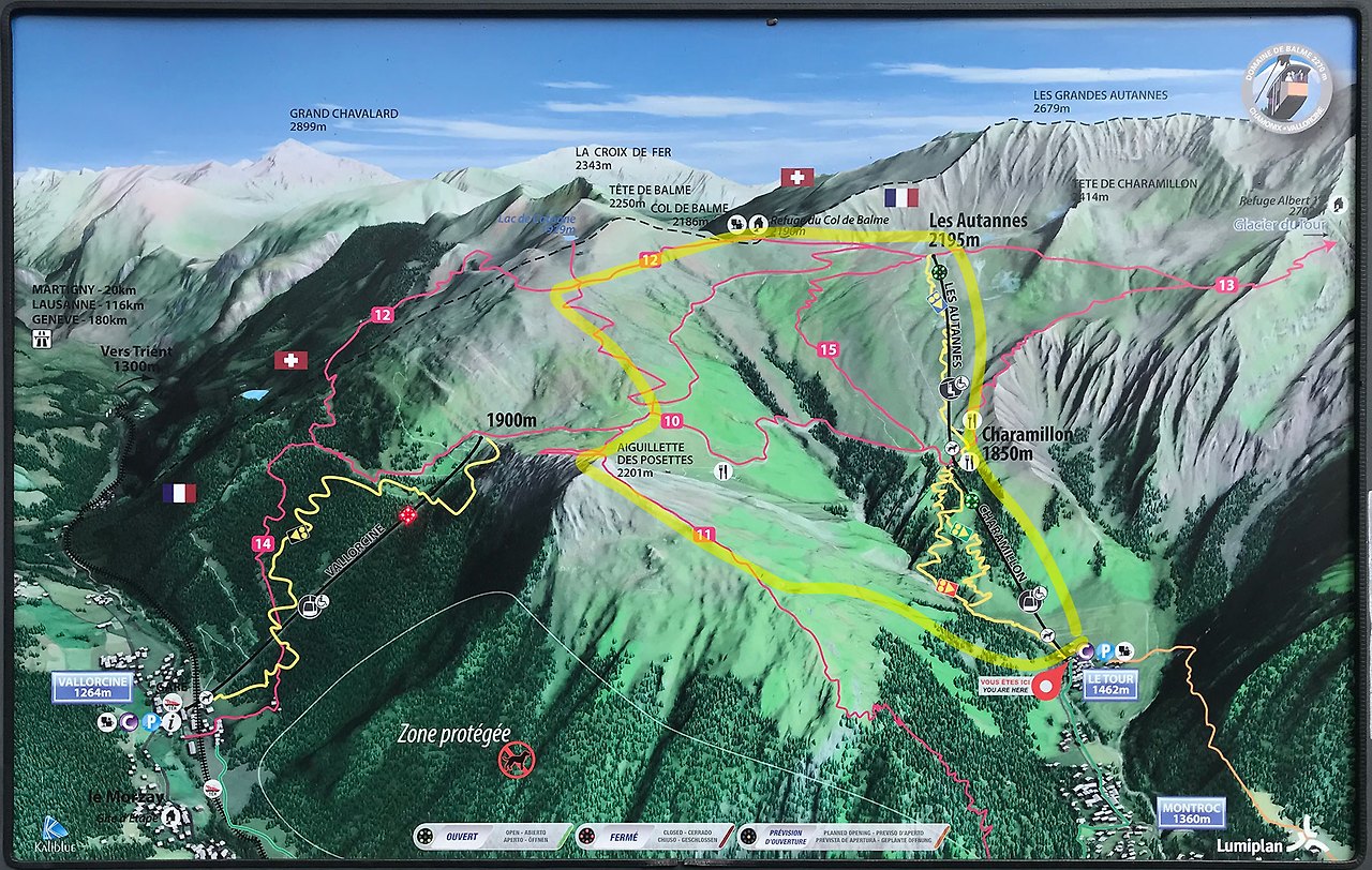 부슬부슬 내리는 관계로 TMB에서 상대적으로 고도가 낮은 코스부터 오르는것이 안개에 의한 시야 가림을 어느정도 막을 수 있을듯 해서 선택한 Col de Balme tracking, 이 코스는 Le Tour에서 시작해서 L'Aiguillette des Posettes(2201m)까지 올랐다가 다시 원점회귀하는 코스로 한다.(노란색으로 칠 해진)