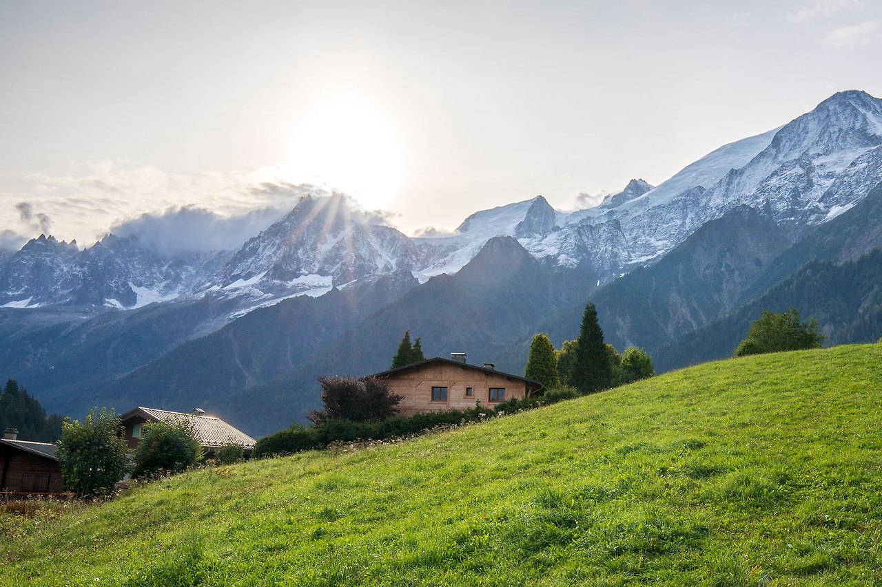 바로 이곳, 뒤에는 몽블랑이 둘러쳐져 있고 오두막같이 생긴 집 주위로 파랗게 형성된 초원지대