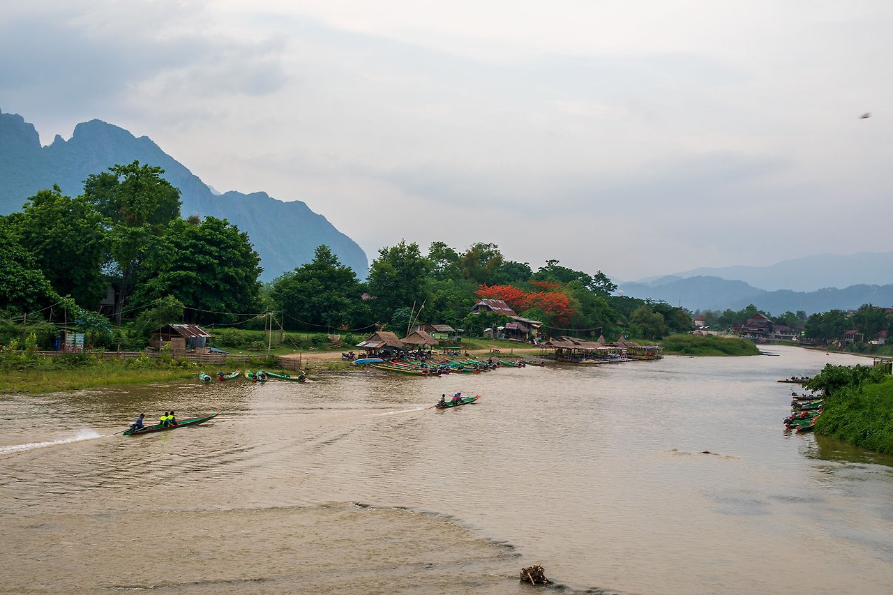 쏭강을 따라 롱테일보트가 운항을 시작했다.